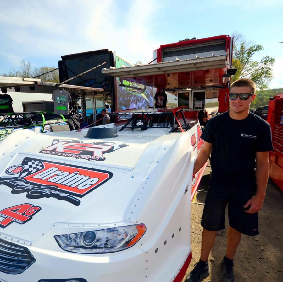 Kody Evans stands beside his Club 29 racecar at Atomic (OH) Speedway prior to a Lucas Oil Late Model Dirt Series showdown